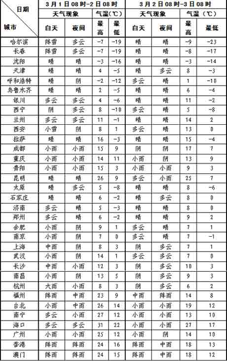 3月2日08时至3日08时,新疆北部、黑龙江东部有小雪或阵雪;江南南部、华南、西南地区东部等地有小雨或阵雨,局地有中雨;内蒙古中西部、黑龙江东部及东部和南部沿海等地有4~5级风;台湾海峡有9级、阵风10级的风,东海南部、南海东北部有7~8级、阵风9级的风。