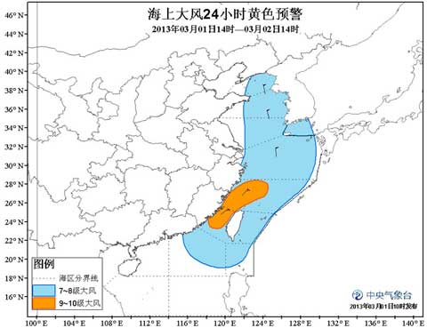 中央气象台3月1日10时继续发布海上大风黄色预警: