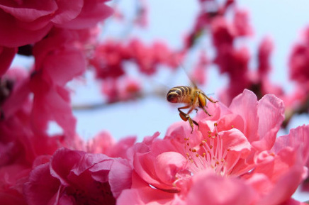 3日,泉州东湖公园内桃花灼灼。公园内,蜜蜂正采蜜忙。(图片来源:新浪微博)