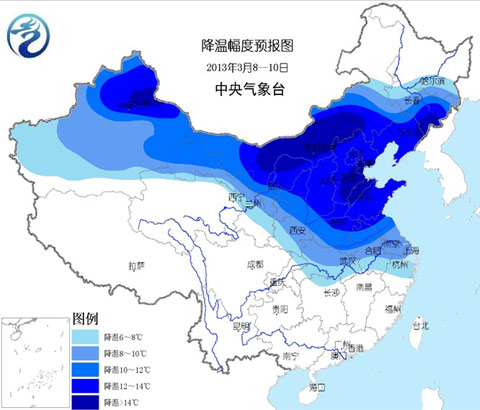 但是,升温的态势将被冷空气的到来阻断,中央气象台预计,8~10日,一股强冷空气将自西向东影响我国大部地区,长江中下游及以北地区气温将下降6~10℃,其中,新疆北部、内蒙古中西部、华北、黄淮、东北地区南部的部分地区降温幅度可达10~14℃。