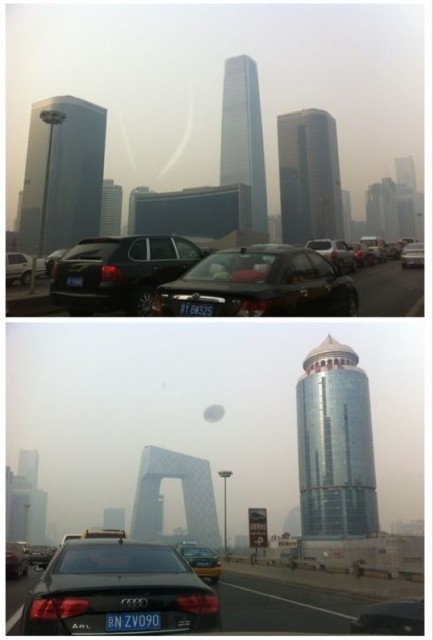 今天,北京城区被雾霾笼罩,能见度较差。(图片来源:新浪微博)