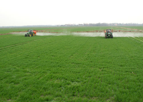 图为:龙亢农场一家庭农场正在实施小麦防病治虫喷施作业。