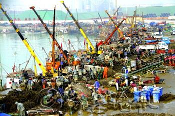3月6日下午两点,随着一艘艘渔船满载归来,摔打声、机器的轰鸣声充斥着整个山东日照岚山渔港码头,工人们又开始忙碌起来。