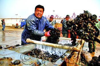 来岚山收购海虹的客户大部分是青岛、烟台、威海等地的一些加工厂。渔民们当天收上来的海虹,经过清洗、装袋后直接就被这些客户用货车拉走了。