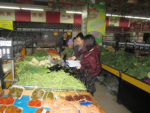 图为3月8日上午,县农业局检测站工作人员对县城超市的蔬菜进行例行抽样