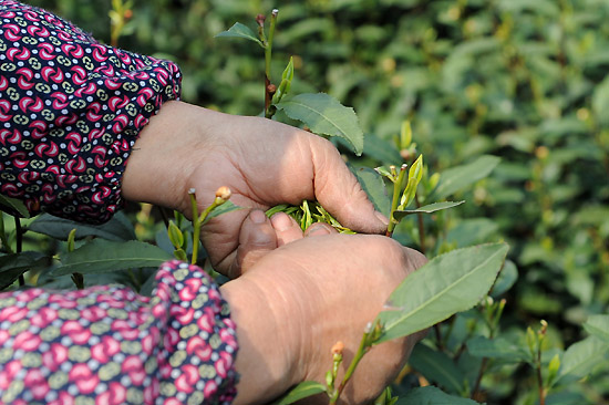 3月12日,杭州市西湖区龙井村的一名茶农在自己的茶园里采摘新茶。