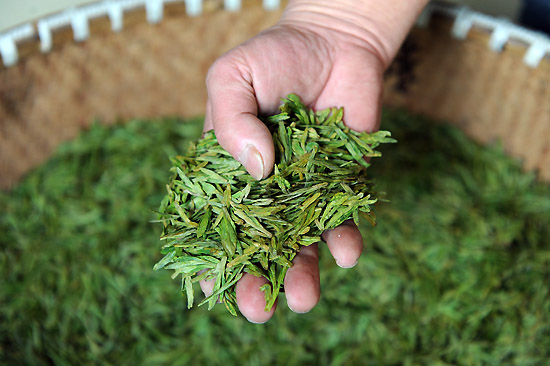 3月12日,杭州市西湖区龙井村的一名茶农在晾晒刚采摘回来的西湖龙井茶新叶。