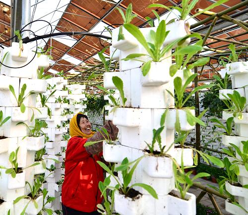 3月14日,农民于秀香在山东省即墨市一处太阳能光伏大棚里管理立体栽培的蔬菜。