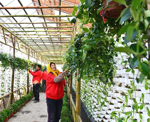 3月14日,农民在山东省即墨市一处太阳能光伏大棚里管理立体栽培的蔬菜。