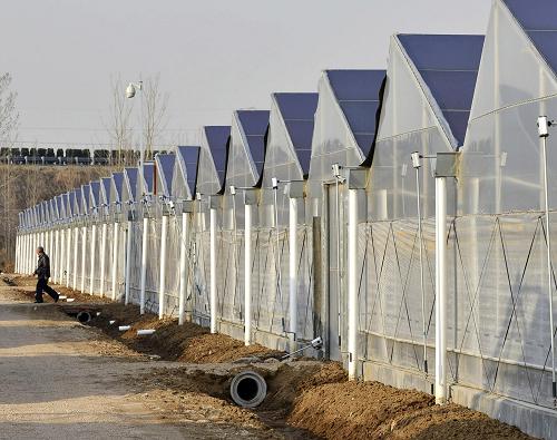 即墨市积极探索将光伏、现代农业和新型城镇社区有机结合,打造新型城镇化“太阳能小镇”。该模式将多个自然村的土地集中起来,建设光伏农业科技大棚,当地农民以土地入股并就近在棚内劳动,通过股金分成带来财产性收入,通过劳动带来工资性收入。由企业投资建设“太阳能小镇”的中心社区,并配套建设一定规模的光伏大棚,棚内种植高附加值作物,棚顶利用太阳能发电,产生的清洁电力供社区使用。目前,即墨市已开发太阳能光伏大棚500余亩,正加快建设“太阳能小镇”。新华社发(宁友鹏 摄)