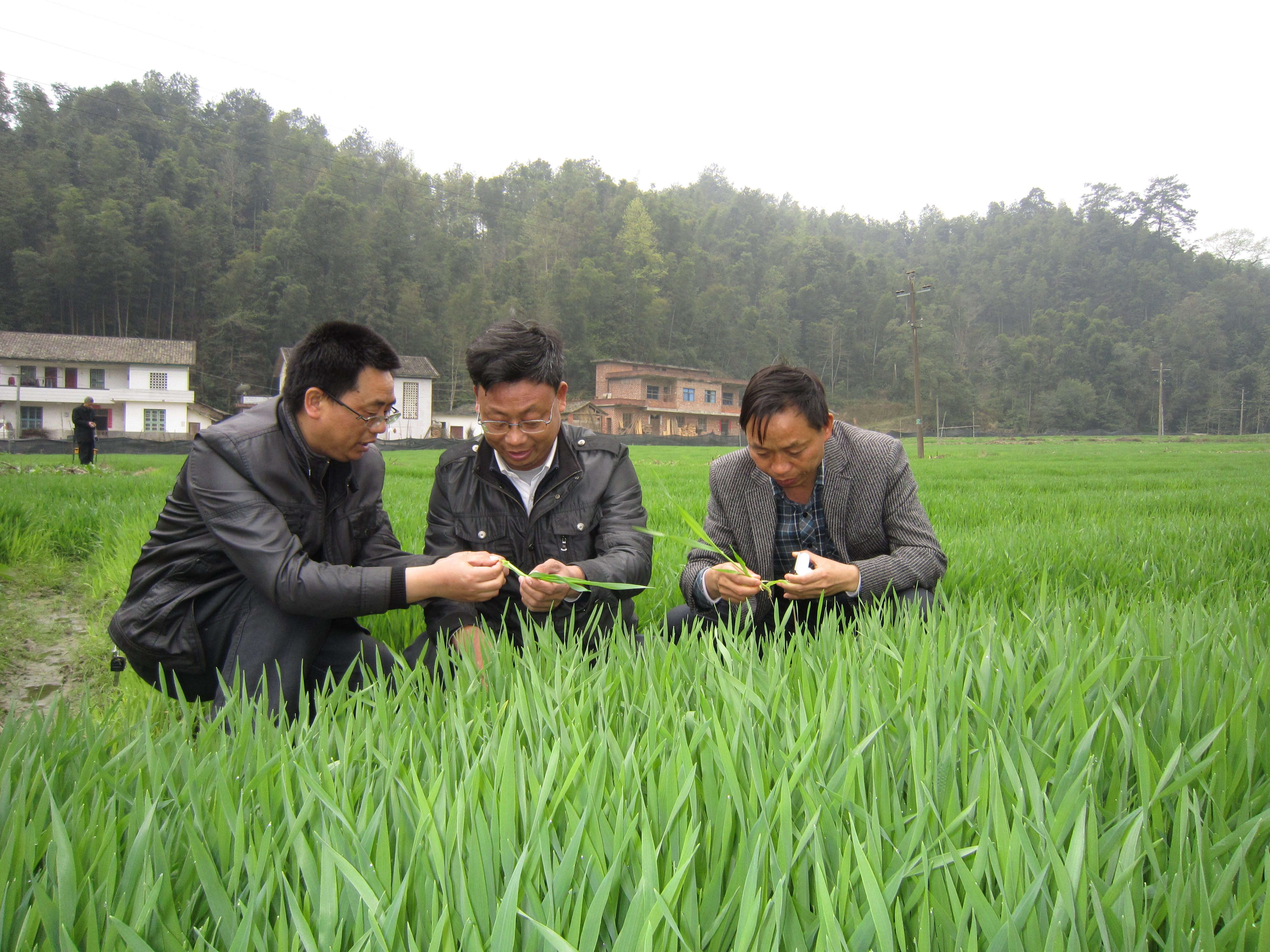 江西金源农业公司在万载县茭湖乡谢溪村充分利用冬闲田与农民订单栽种有机麦,有机嫩麦经脱水加工后成麦茶销往日本,每亩农民可增加纯收入1800多元,实现了一年三熟,仅此一项茭湖乡谢溪村农民实现人均增收200多元。图为3月14日,该县农业局农技专家在茭湖乡谢溪村观察有机麦生长情况。(朱业斌摄)