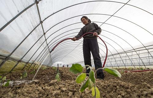 3月14日,巫山县巫峡镇桂花村村民龙宗菊在给茄子苗浇水。新华社记者 陈诚 摄
