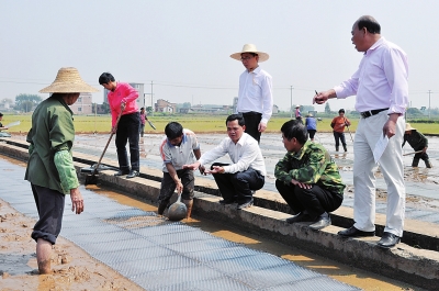 近日来,港南区组织农业技术人员到村屯田间地头,科学指导农民春耕、春播,全区春耕、春播迅速掀起高潮。截至3月11日,全区共建立集中连片防寒技术育秧基地23个,已播秧田2万多亩,占应播种面积的86%。图为农业技术人员在桥圩镇永梧村永兴屯示范基地指导农民春播现场。