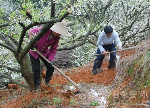 永安市西洋镇水果总面积35330亩,其中李类面积就达15366亩,年总产量12784吨。开春以来,该镇的果农抢时争季对果园精耕细作、精心管理。图为该镇内炉村农户廖守良夫妇在自家芙蓉李园培土、下“座果肥”。