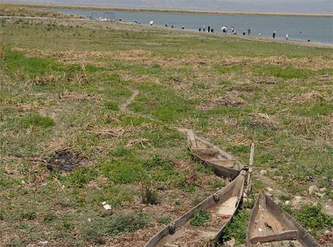 记者21日驱车沿湖边行驶看到,杞麓湖湖水已经退至湖中心地带,部分村民已将干涸的湖底开垦出来种上蔬菜,成群的羊儿在湖里啃食着绿油油的野草,田地缺水的村民正在将刚买来的水管拉向湖中仅剩的水源点,踩在枯死的水葫芦上,嘎吱作响。