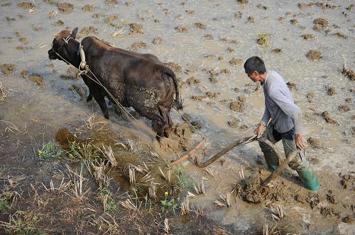 3月21日,一名农民正在犁田。新华社记者刘续摄