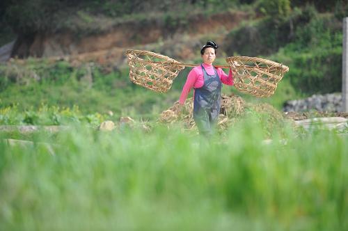 3月21日,一名苗族妇女挑着箩筐下地干活。新华社记者刘续摄