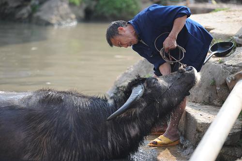 3月21日,一名农民正在为耕牛洗澡。新华社记者刘续摄