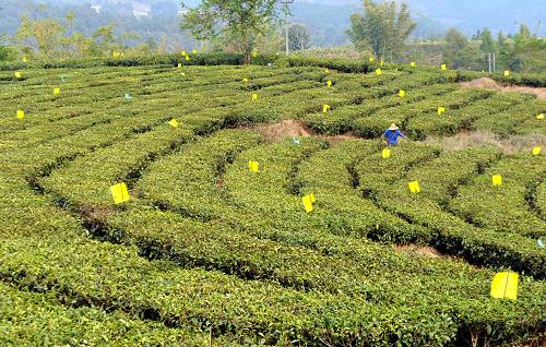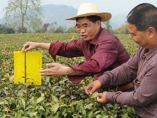 今年开春,云南梁河县茶叶技术推广站向全县茶叶种植区推广、使用茶园生物防控新技术,引导茶叶种植户在全县5.2万亩台地茶园中普遍设置黄蓝杀虫板,倡导茶农摒弃喷洒杀虫剂,取得良好效果。该方法实地应用后,有效预防了茶叶病虫害,并保障上市春茶不带农残,同时还让种植户每亩茶地节约防虫投入160元。新华社记者陈海宁摄