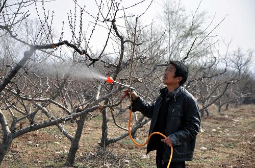 3月26日,在山西平陆县圣人涧镇北桥村,一名果农在为桃树喷施杀虫剂。春分过后随着气温回升,果树春季管理也进入高峰。走进山西平陆县的果园,田间地头到处是一片繁忙的景象。山西平陆县是山西省优质苹果生产基地县,2012年平陆县果树种植面积约40万亩,实现产值近10亿元,仅果业一项农民人均增收就达到2370元。