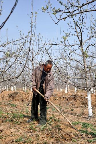3月26日,在山西平陆县圣人涧镇槐树下村,果农尚福仁在清理果园。