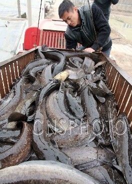 3月26日,河南省焦作市武陟县詹店镇兴鱼渔业合作社的社员正在将鲶鱼出塘外运。当日,焦作市武陟县詹店镇兴鱼渔业合作社喂养的600万斤鲶鱼开始全面出塘,社员们加紧捕鱼外运作业。兴鱼渔业合作社从2000年开始利用温室喂养鲶鱼,结束了我国北方地区不产鲶鱼的历史。目前,该合作社入社社员达200多户,年产鲶鱼2000万斤。