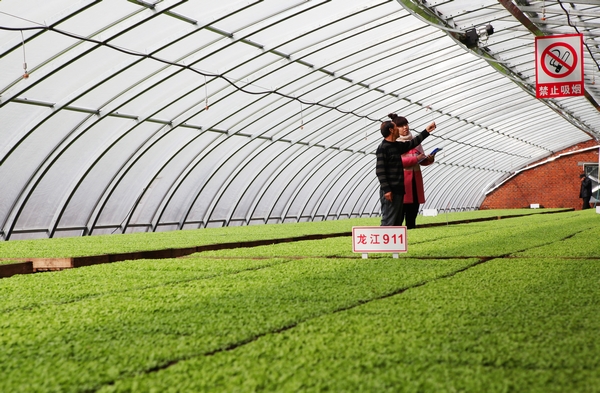 3月26日,在宁安烟叶公司范家基地单元中心站育苗工场的PVC阳光温室内,工作人员在悉心培育烟苗。