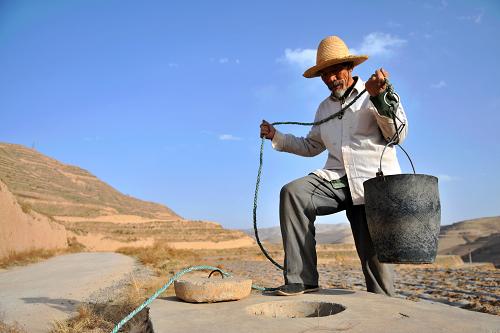 3月28日,在甘肃省定西市安定区鲁家沟镇清水村,村民何发全从一眼快要干涸的水窖里取水。