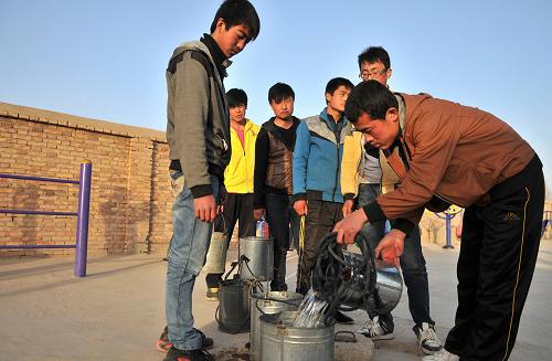 3月28日,在甘肃省定西市安定区石峡湾乡初级中学,学生们在水窖旁排队打水。