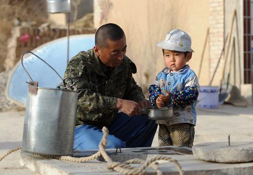 3月28日,在甘肃省定西市安定区鲁家沟镇清水村,村民杜卫斌在家里最后一眼有水的水窖旁给孩子洗手。