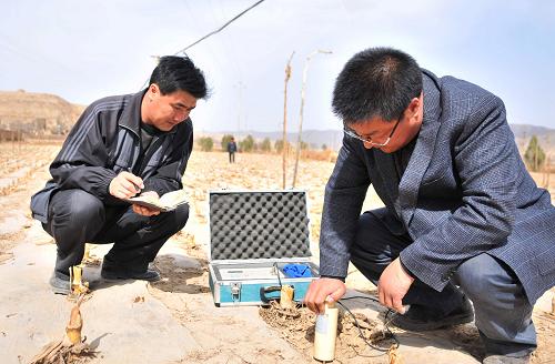 3月28日,在甘肃省定西市安定区鲁家沟镇清水村,当地农业技术推广服务中心研究员邢国(右)在玉米地给土壤测墒。
