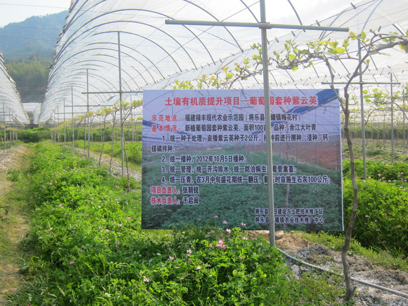 近年来,将乐县积极推广园地套种紫云英种植模式,该县2012年推广种植紫云英面积2万亩,除在水田种植推广外,还在柑桔园和葡萄园等园地推广紫云英0.6万亩。