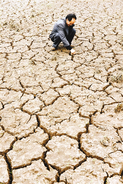 4月5日,重庆潼南县柏梓镇三边村的村民古正伦望着龟裂数月的田地。 今春以来,受降雨持续偏少等因素影响,重庆部分地区旱情持续加重,严重影响了农业生产。