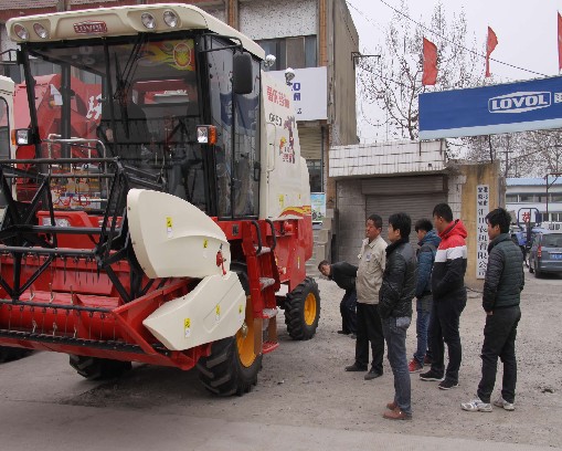 “张大爷,来买联合收割机啊”,“是啊,前几年买了一台,效益还相当不错,一年下来收入两三万元,听说今年农机补贴已经启动,带孩子一起来再挑选一台新的。”