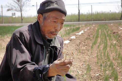 4月9日,蒲城县三合村78岁的村民范昭亭在查看旱情。新华社记者 都红刚 摄