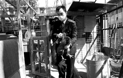 昨日,西城区团结大院,西城区动物卫生监督所工作人员从鸡舍里抓出活鸡。新京报记者薛s??/P>