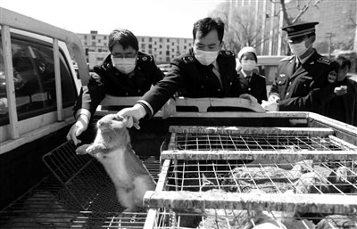 昨日,西城城管查获一辆私自售卖活鸡、鸽子、兔子的面包车。新京报记者薛s??/P>