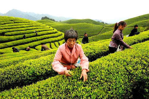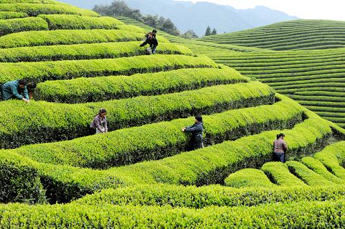 4月14日,采茶工在浙江省武义县一茶园采摘茶叶。