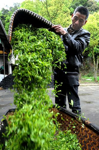 4月14日,浙江省武义县一名采茶工在过秤刚采摘的鲜茶叶。