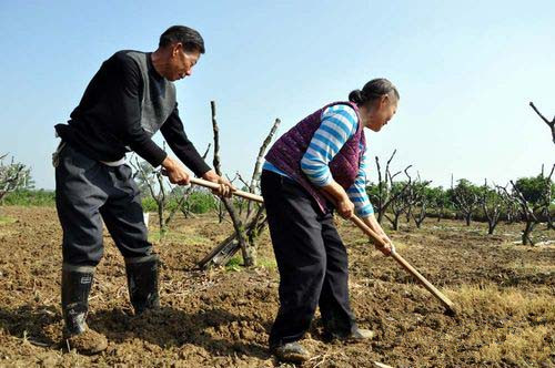 为彭先进夫妇在高换果树地里,挖沟准备下种生姜。