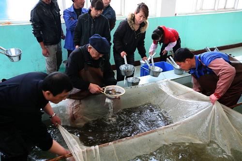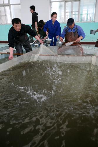 当日,天津市国家级大型水产育苗基地――换新水产良种场培育的两亿尾黄金鲫鱼苗从天津起程,随前来购买鱼苗的养殖户一起,南下江苏等地。黄金鲫是天津换新水产良种场经过多年育成,通过远缘杂交获得的优质鲤鲫杂交新品种,具有生长快、营养价值高,耐长途运输等特点。该品种已经我国水产原种和良种审定委员会审定通过,可在全国范围内进行池塘养殖。新华社发(任丽华 摄)