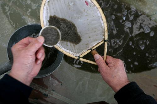 4月17日,天津市宁河县换新水产良种场工作人员在打捞黄金鲫鱼苗。