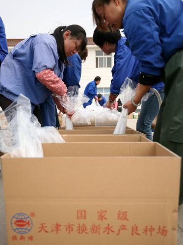 4月17日,天津市宁河县换新水产良种场工作人员将捞起的黄金鲫鱼苗装箱,准备外运。