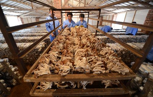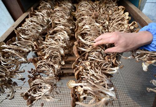 4月18日,广昌县甘竹镇廖家山村农民在烘烤茶薪菇。