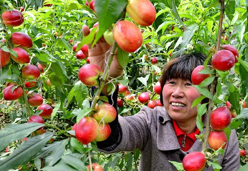 4月27日,昌黎县马坨店乡小林上村的村民马秀菊在收获成熟的油桃。
