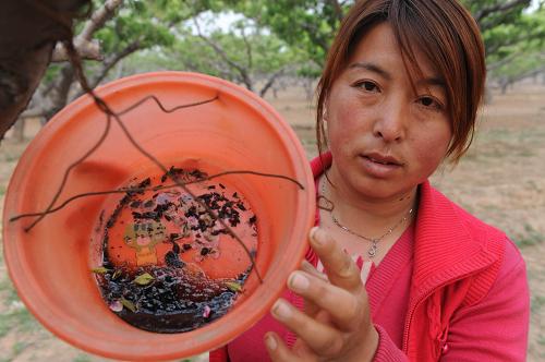 近日,中国蜜桃之乡――河北深州市的桃树进入坐果关键期,当地桃农利用生物诱杀技术消灭飞蛾,以保证培育出的蜜桃绿色、安全。