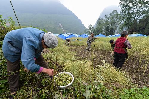 眼下,地震灾区四川芦山县已进入“双抢”季节,当地群众和参与援建的官兵一起,在安置帐篷旁边积极展开生产自救,力争把灾害损失降到最低。