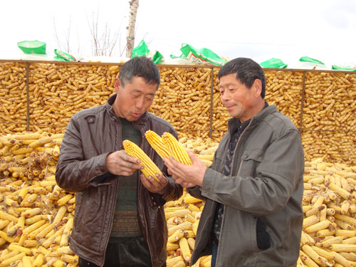 4月19日,明水县育林乡胜利村农民袁纯明的家里有很多当地农民前来取经。袁纯明是当地有名的科技迷,平常的年头当地的盐碱地玉米亩产最多达到1200斤,而他采用的破垄夹肥种植方法,去年他家的玉米亩产1500斤。图为袁纯明(左)正在向村民介绍他的种植经验。