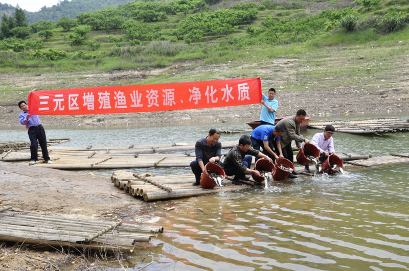 5月3日上午,三元区农业局在东牙溪水库开展花鲢、白鲢、倒刺耙鱼增殖放流工作。东牙溪水库是市区30万居民的重要生活饮用水源地。此次放流的花鲢、白鲢为滤食性鱼类,不仅能增强水库水域内鱼类种群,维护生态平衡,而且有助于水库内藻类去除、生态清淤,起到净化水质的作用。当天共放流花、白鲢21.2万余尾、黑脊倒刺耙8000余尾。