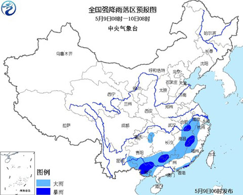 中央气象台5月9日06时继续发布暴雨蓝色预警: